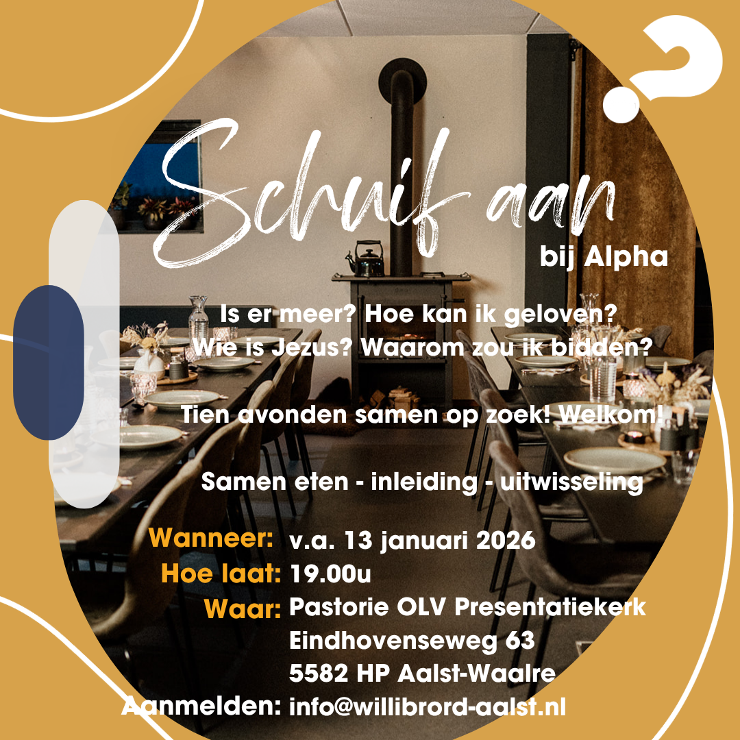 In januari start in onze parochie weer de Alphacursus. Alpha bestaat uit zo'n 10 interactieve en gezellige avonden – mét warme maaltijd! – waarin je samen met anderen kan ontdekken wat het christelijke geloof inhoudt en wat het voor jou zou kunnen betekenen. Een avond bestaat uit een maaltijd, een verdiepende inleiding en gesprek. Een diverse groep inleiders komt spreken over vragen zoals: Wie is Jezus? Waarom bidden mensen? Wat doet de Heilige Geest? Iedere avond is er ruimte om in gesprek te gaan. Of je nu rotsvast gelooft of helemaal niet, veel twijfels hebt of zoekende bent: iedereen is welkom! De bijeenkomsten zijn wekelijks op dinsdagavond in de pastorie van de Onze Lieve Vrouw Presentatiekerk te Aalst. We zullen ook op een zaterdag samenkomen. De avonden starten op dinsdag 13 januari en gaan, met uitzondering van carnaval, door tot en met dinsdag 24 maart. Vanaf 18.30u is de inloop en om 19.00u gaan we gezamenlijk aan tafel voor de maaltijd. Daarvoor wordt een vrijwillige bijdrage gevraagd. De avond duurt tot uiterlijk 21.30u. De eerste avond op 13 januari is een open avond. Iedereen die interesse heeft is welkom. Aanmelden kan via info@willibrord-aalst.nl of via 040 - 201 75 74.
