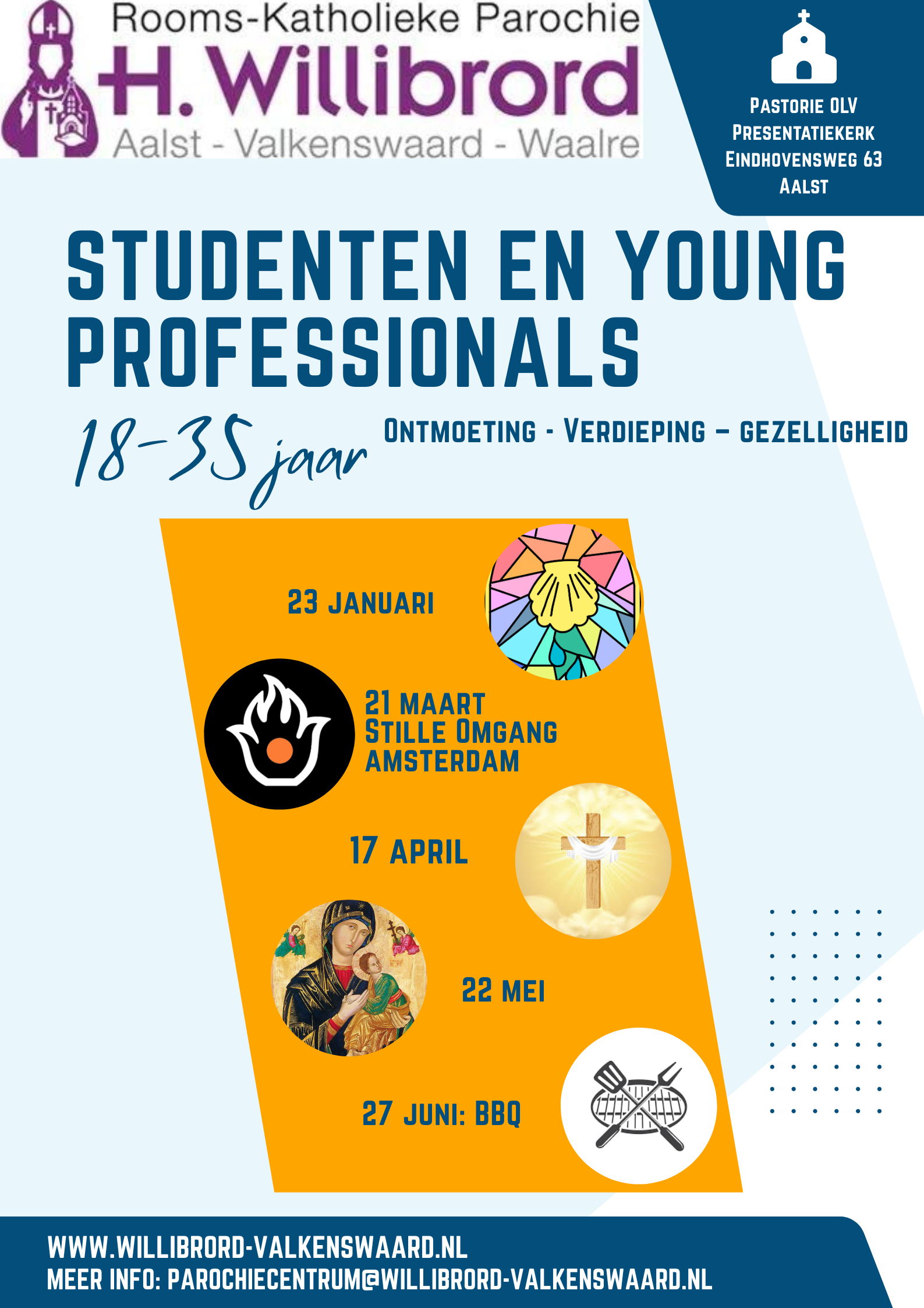 In 2025 zijn we in onze parochie gestart met avonden voor studenten en young professionals in de leeftijd van ongeveer 18-35 jaar. Deze groeiende groep leeftijdsgenoten met inmiddels zo'n 25 betrokkenen combineert verdieping in het katholieke geloof met gezellige activiteiten. Zowel diepgewortelde als nieuwe katholieken zijn van harte welkom om elkaar, het geloof en de parochie beter te leren kennen. We organiseren een aantal keer per jaar bijeenkomsten, van sociale activiteiten zoals een verdiepingsavond, borrels en uitjes.
